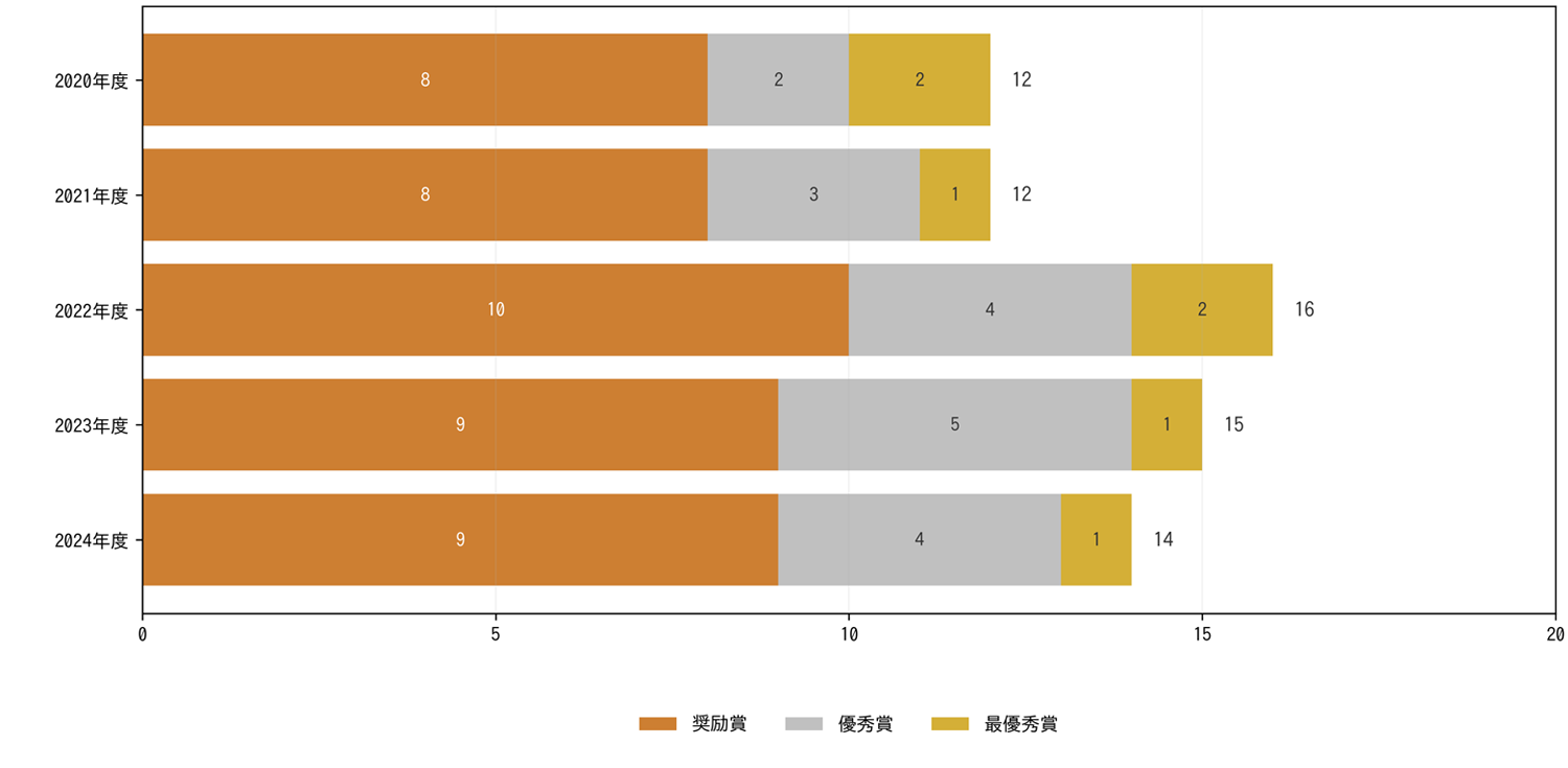 2020〜2024年度の5年間で、対象6か国・募集先41機関を範囲として実施し、計69件の表彰を行いました。(最優秀賞7件、優秀賞18件、奨励賞44件)。年度別の表彰件数は12〜16件の範囲で推移しており、年ごとの変動は限定的でした。国別分布では、受賞者数はインドネシアが最多で、次いでベトナム、フィリピンが続きます。最優秀賞はインドネシアとベトナムに集中しています(図表1・2)。