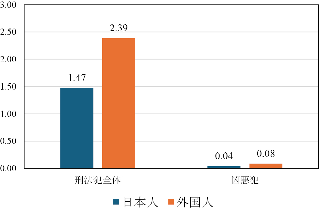 人口当たりの交通業過を除く刑法犯の検挙人員を見ると,日本人が1,000人当たり1.47人,及び外国人が2.39人となっている。また,殺人などの凶悪犯罪については,日本人が0.04人,外国人が0.08人となっている(図2)。