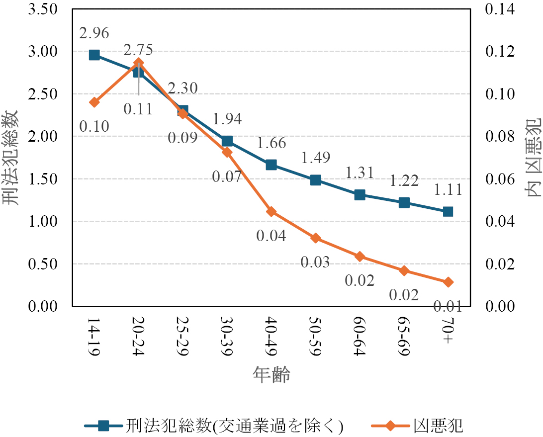 そのヒントになるのが,まずは日本人の年齢別の犯罪率である。先ほど見たように日本人の刑法犯全体で見た犯罪率は1.47人/千人であるが,年齢別に見た場合,もっとも低い70歳以上の1.11人/千人から20-24歳の2.75人/千人まで幅がある(図3)。