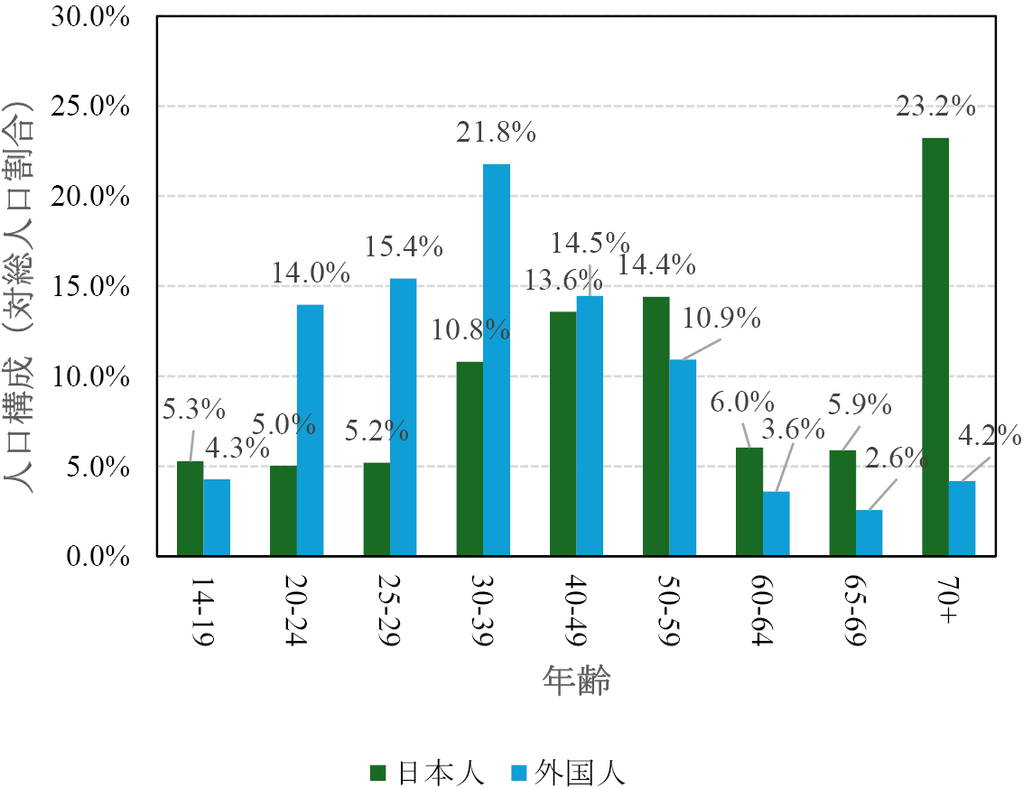 図4 日本人,及び外国人の年齢別人口構成
