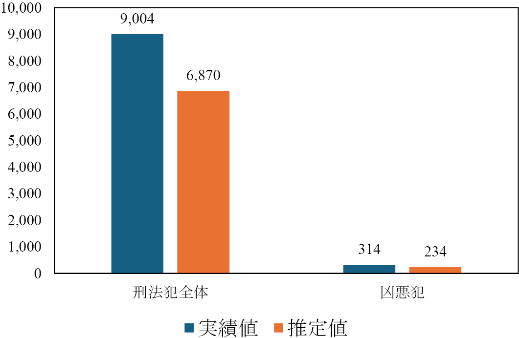 その結果,外国人の検挙人員の推定は6,870人となり,実績値は推定値の約1.3倍の9,004人となった(図5)。また,凶悪犯については推定値が234人であるのに対して,実績値は314人であり,推定値の約1.3倍であった。このことは,外国人の犯罪率は若年人口が日本人よりも多いという年齢構成の違いを考慮しても,なお日本人よりも高いことを示している。