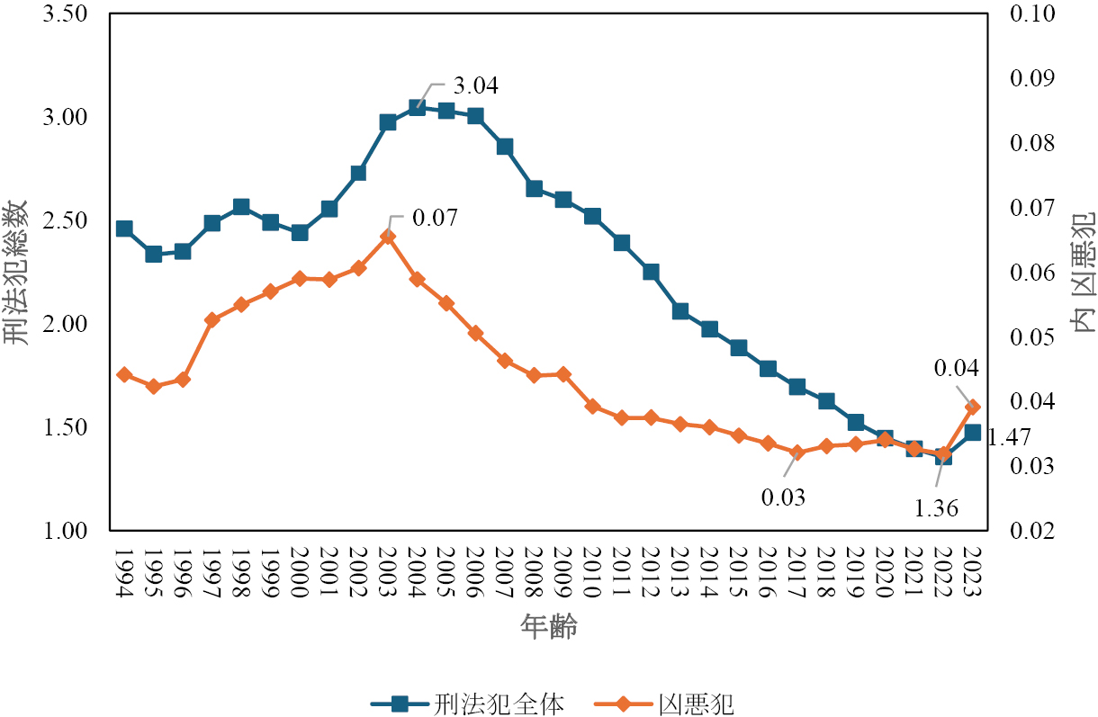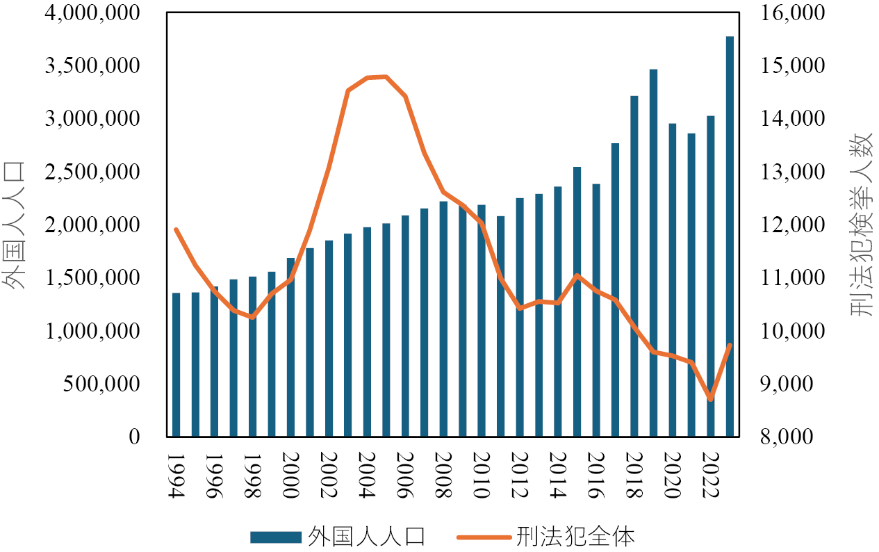 このように日本人の犯罪率が趨勢的に低下している場合,外国人の犯罪率に変化がなくても,相対的に高く見えることも考えられる。